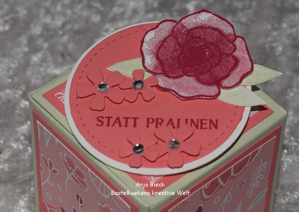 Verziert habe ich die Box mit dem Stempelset Definition von Glück ( Art 149818 ) mit den passenden Edgelits Bildschöne Blüten ( Art 148526 )